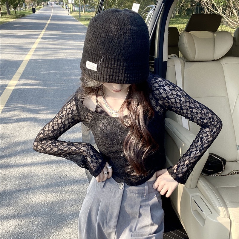 Red 2022 musim panas baru keinginan murni top T-shirt wanita bagian pendek dilubangi lengan panjang rasa desain dalam renda bottoming kemeja pasang