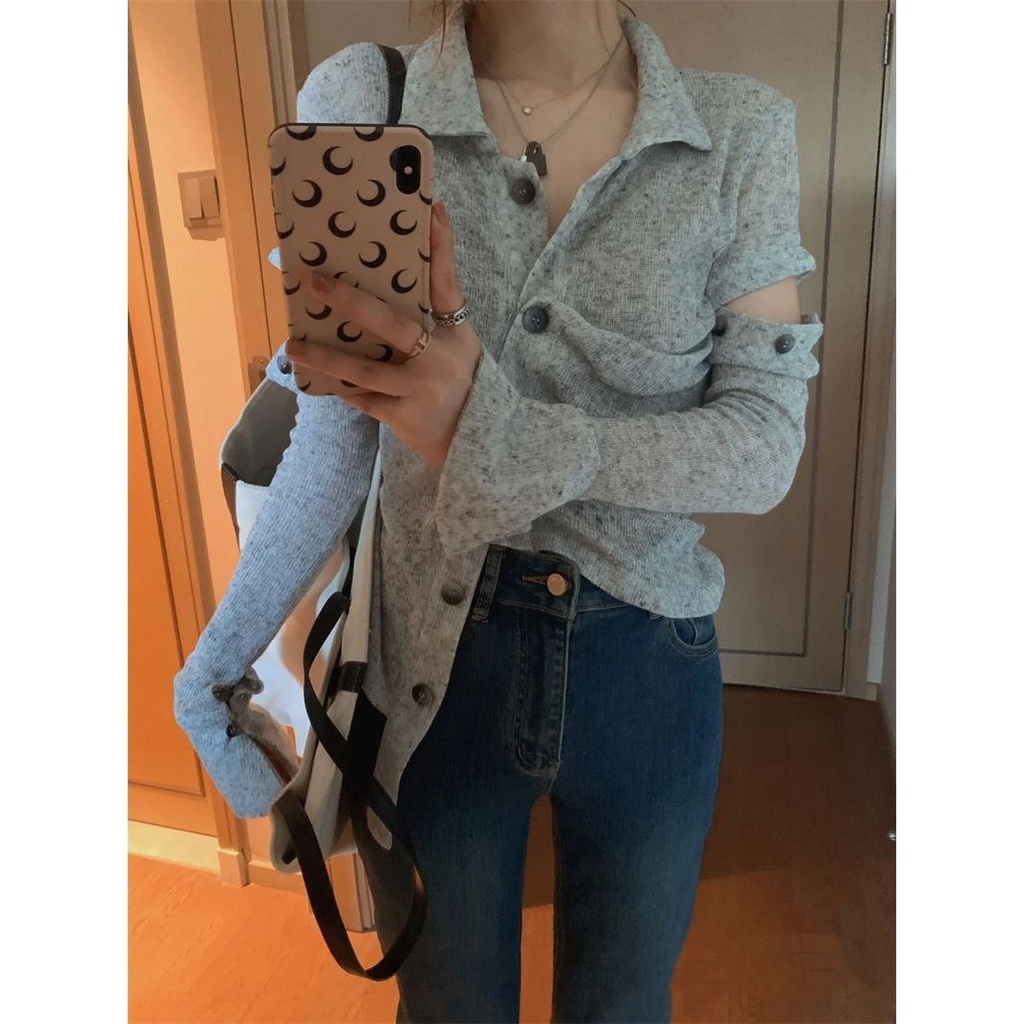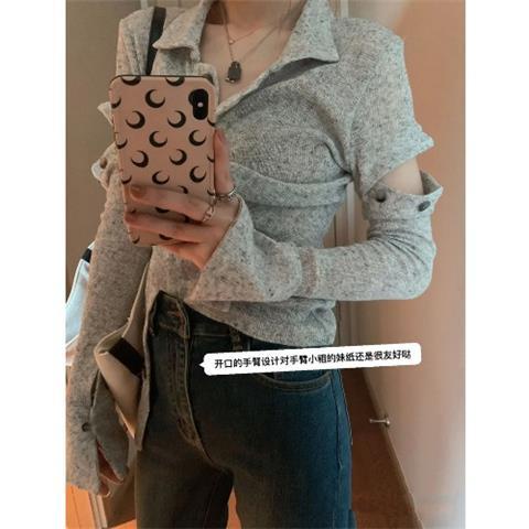 Pakaian Wanita > Batik > Atasan Batik > Red Abu-abu Rajutan Sweater Wanita Musim Gugur 2022 Baru Niche Desain Rasa Diri Budidaya Slim Kemeja Chic Top Wanita