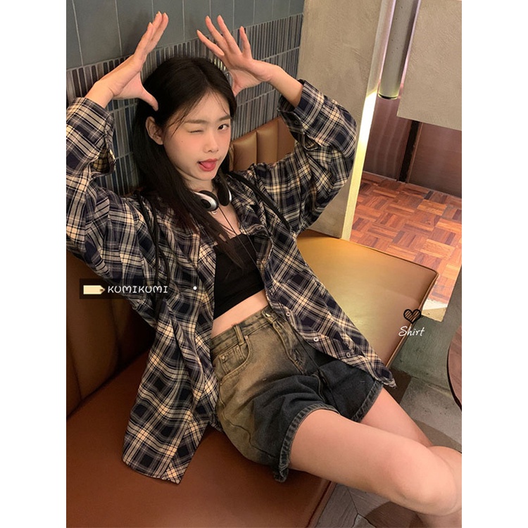 Red American All-Match Gaya Hong Kong Longgar Lengan Panjang Kemeja Jaket Kotak-kotak Kemeja Wanita Musim Semi Retro Bagian Tipis Tabir Surya atasan Kemeja
