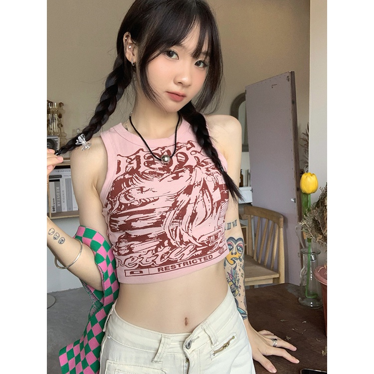 Red American Retro Aku Berbentuk Rompi Kamisol Wanita Musim Panas Manis dan Pedas Pakaian Luar Pink Spice Girl Tanpa Lengan Pendek olahraga Top