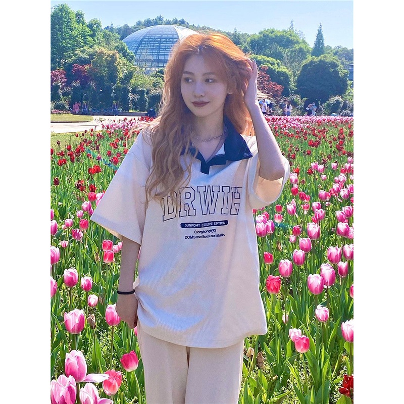 Red American Retro Kasual Lengan Pendek Kerah T-shirt Wanita Musim Panas Rasa Desain Niche Polo Shirt Wanita T-shirt Longgar pasang