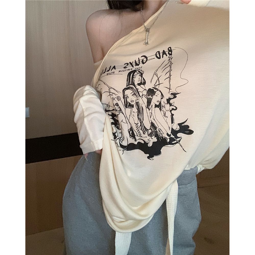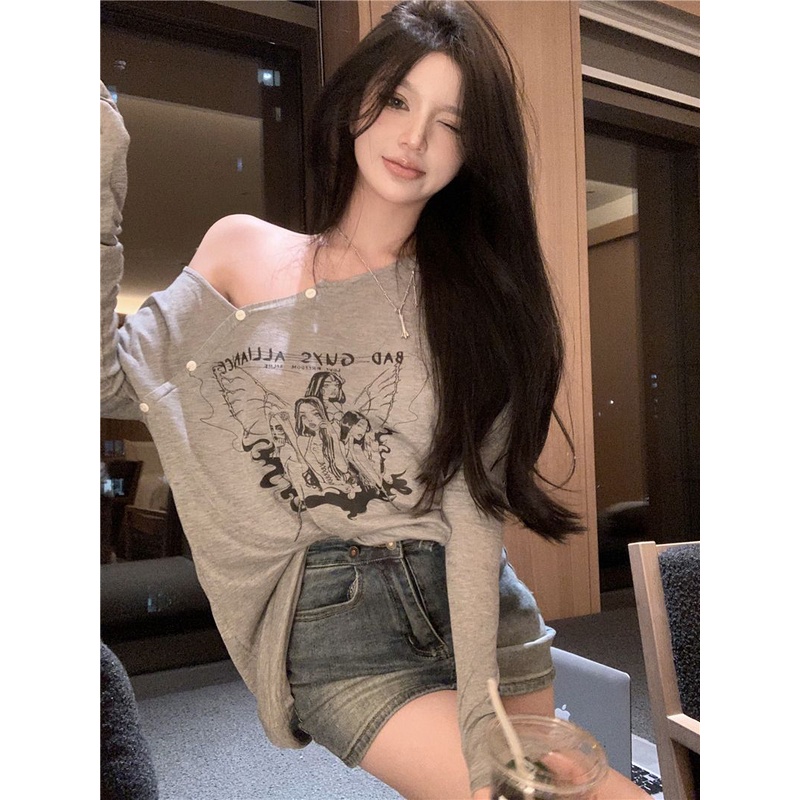 Detail Red American retro off-the-shoulder lengan panjang T-shirt wanita musim semi gadis panas bagian tipis longgar dicetak perlindungan matahari blus desain top