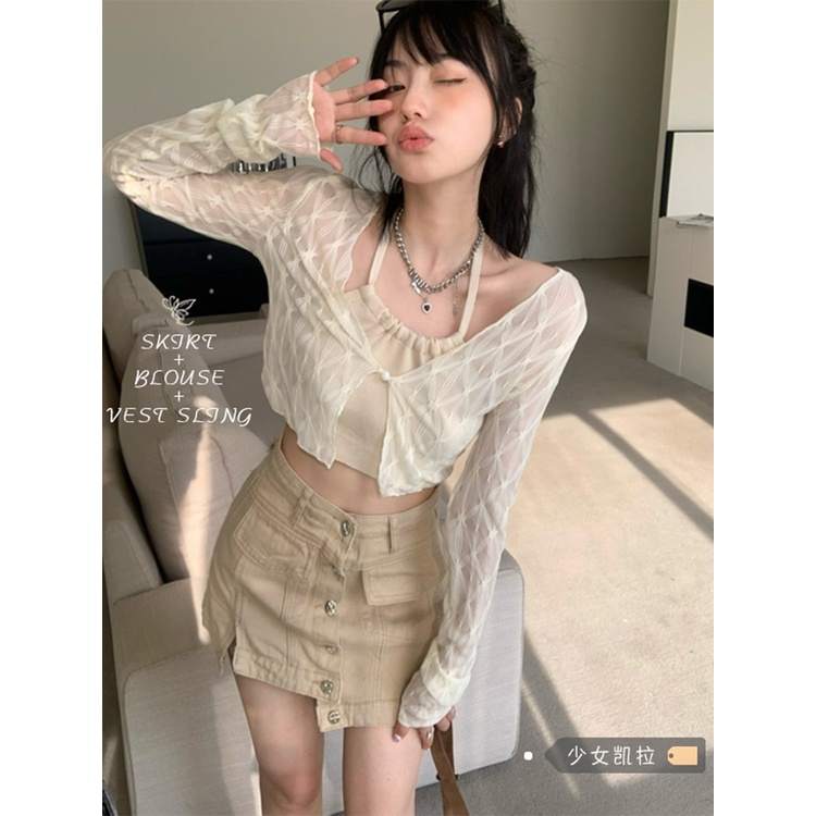 Detail Red Amerika Manis dan Pedas Setelan Rok Pakaian Luar Wanita Top Musim Panas Perkakas Rok Gadis Panas Kamisol Cardigan Dua Potong set