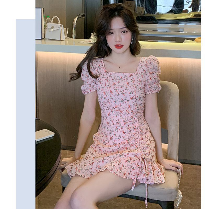 Red Angin lembut rok bunga manis dan pedas musim panas kerah persegi gaun wanita selera desain ceruk pinggang tas serut pinggul rok pendek