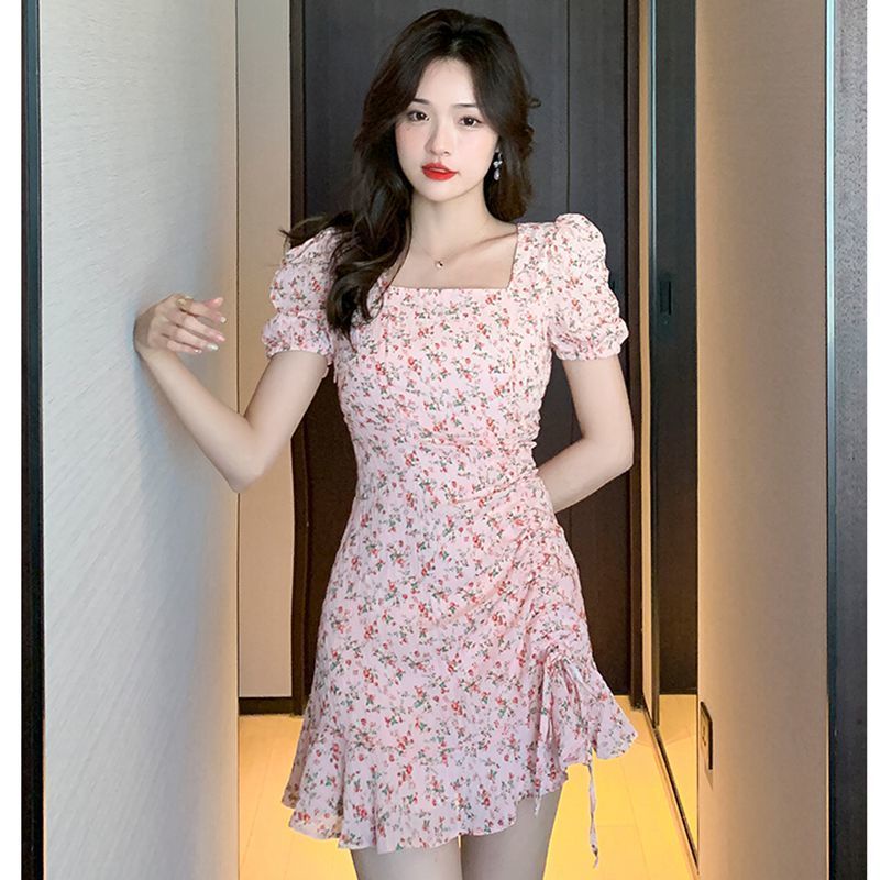 Pakaian Wanita > Batik > Dress Batik > Red Angin lembut rok bunga manis dan pedas musim panas kerah persegi gaun wanita selera desain ceruk pinggang tas serut pinggul rok pendek