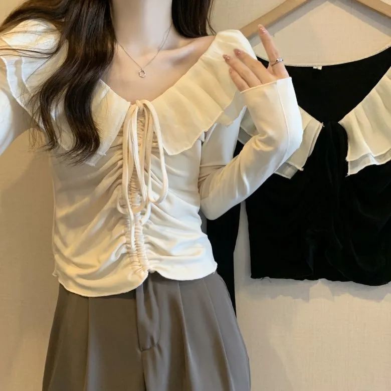 Detail Red Bahasa Perancis Ruffles Serut Lengan Panjang T-shirt Wanita Musim Gugur dan Musim Dingin Model Pendek Bagian Slim Boneka Kerah Kayu tepi Telinga Top