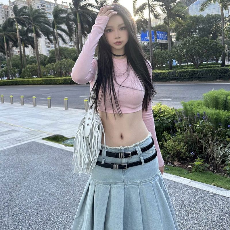 Detail Red Baru Warna Solid Sederhana Hot Girl Slim Lengan Panjang Bagian Dalam Top Wanita Musim Gugur Pakaian All-Match Bottoming pendek Katun T-shirt Wanita