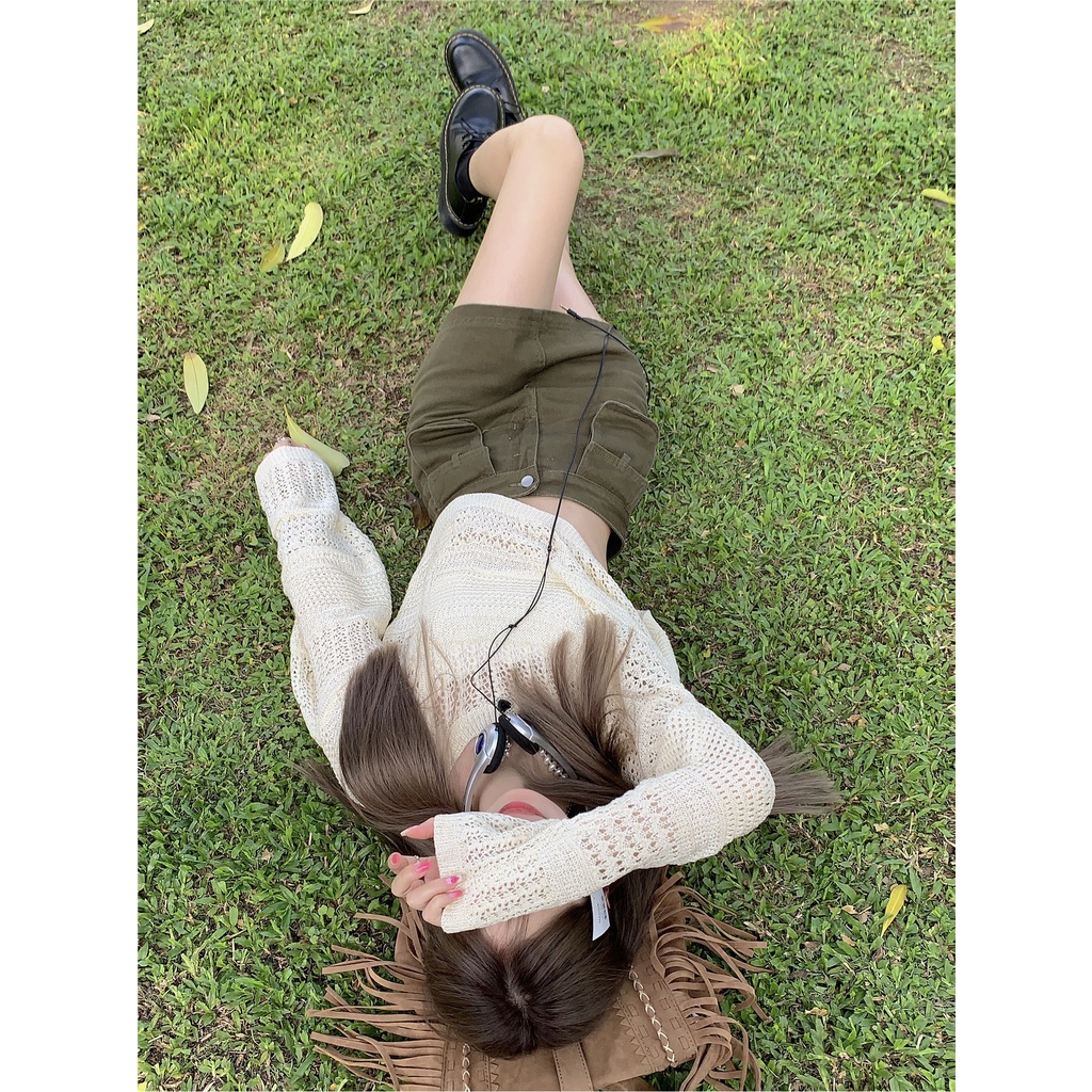 Red Blus rajutan tabir surya berongga pendek untuk wanita untuk dipakai musim panas gadis panas baru rasa desain ceruk atasan lengan panjang manis dan pedas
