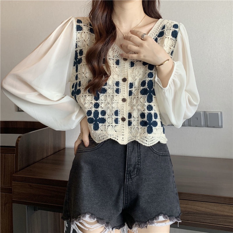 Pakaian Wanita > Sweater & Cardigan > Red Bordir Bunga Berongga Renda Kemeja Musim Semi 2022 Baru Fashion Gaya Asing Lengan Panjang Splicing Pendek Atasan Wanita