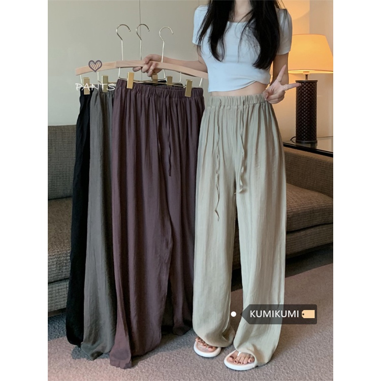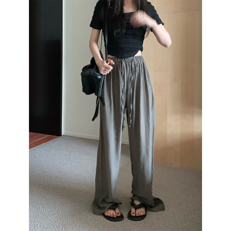 Detail Red Celana kasual wanita pinggang elastis celana lurus musim panas abu-abu menggantungkan celana lebar kaki mengepel celana longgar celana berjalan celana