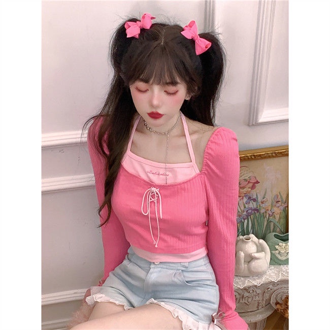 Red Desain gadis manis dan panas bertali leher halter lengan panjang setelan atas wanita awal musim gugur gaya manis dan pedas membudidayakan keinginan murni set dua potong teratas
