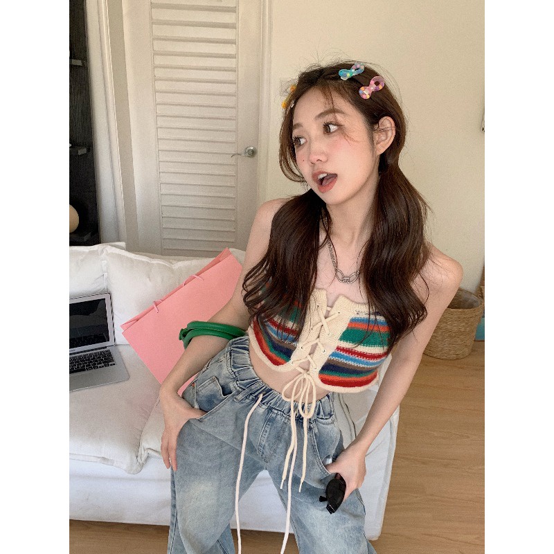 Detail Red Desain Retro Rasa Niche Rainbow Kamisol Pakaian Luar Wanita Musim Panas 2023 Baru Pendek Manis dan Pedas Slim Top