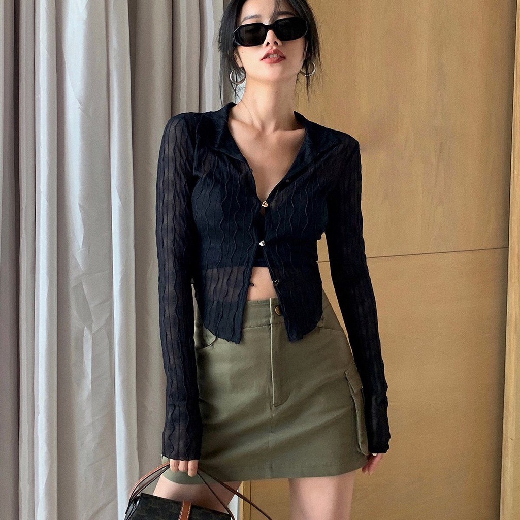 Pakaian Wanita > Batik > Atasan Batik > Red Di sebelah kiri blus tipis berongga wanita dengan kardigan lengan panjang musim panas 2022 perspektif baru kemeja tabir surya pendek