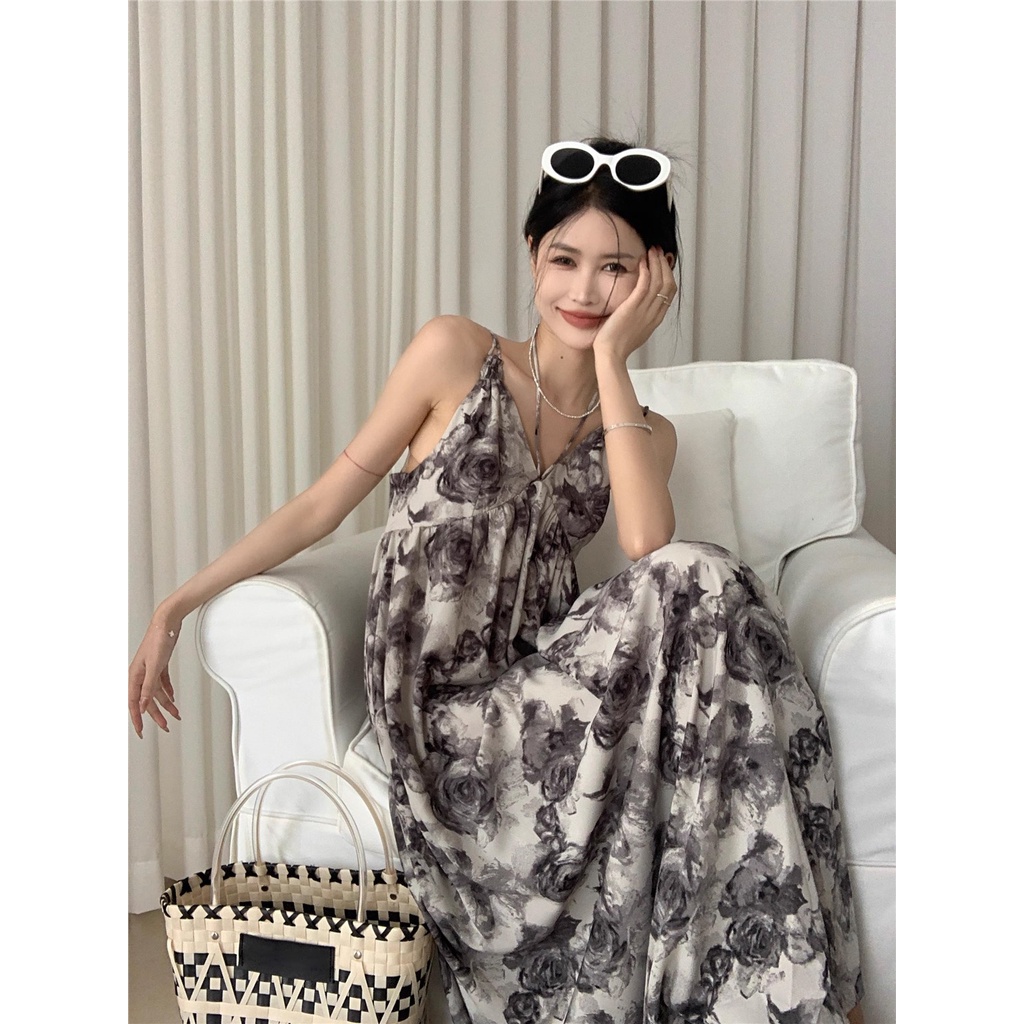 Red dreesPerancis lukisan tinta retro cetak dasi tali menggantung leher suspender rok perempuan musim panas seksi backless rok panjang