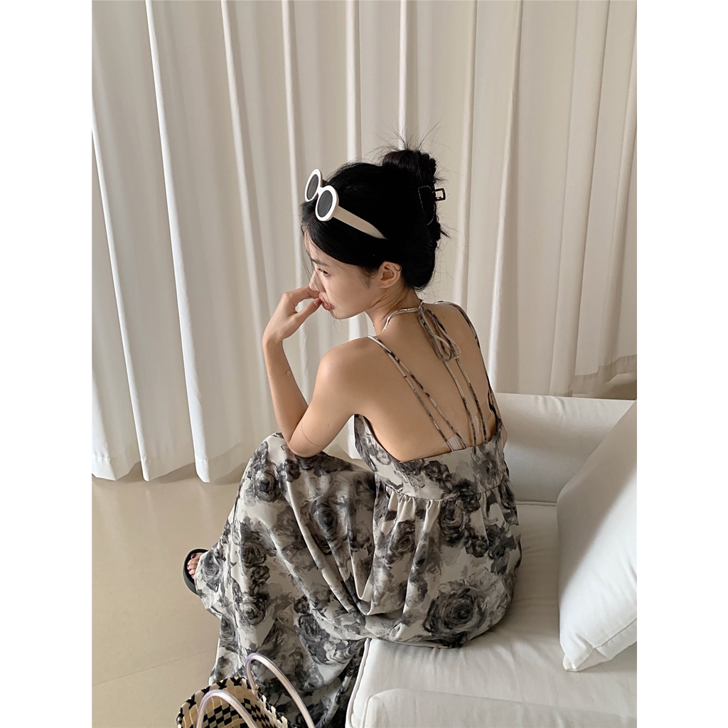 Detail Red dreesPerancis lukisan tinta retro cetak dasi tali menggantung leher suspender rok perempuan musim panas seksi backless rok panjang