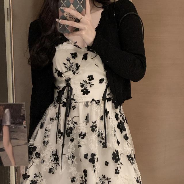 Detail Red Dua Setelan Satu Potong Perempuan Mahasiswa Trendi Perban Floral V-Leher Pinggang Suspender Rok Tutu + Rajutan Tabir Surya Cardigan Jaket