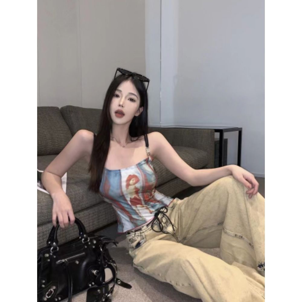 Detail Red Eropa dan Amerika Seksi Babes Merah dan Biru Cetak Kecil Kamisol Wanita Musim Panas Baru Pakaian Luar Diri Budidaya Halter jaket