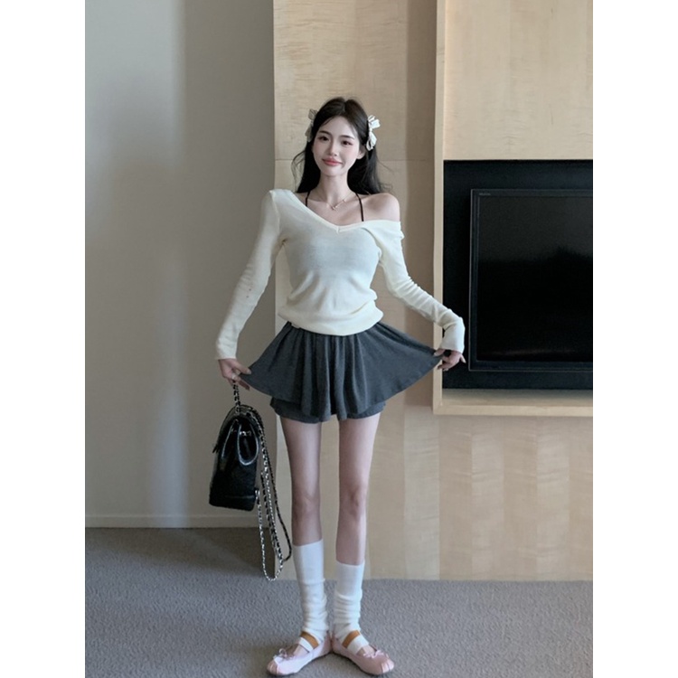 Detail Red Gadis-gadis gaya balet mengenakan setelan pakaian rajut wanita tali leher halter atas rok rok musim panas celana setelan tiga potong
