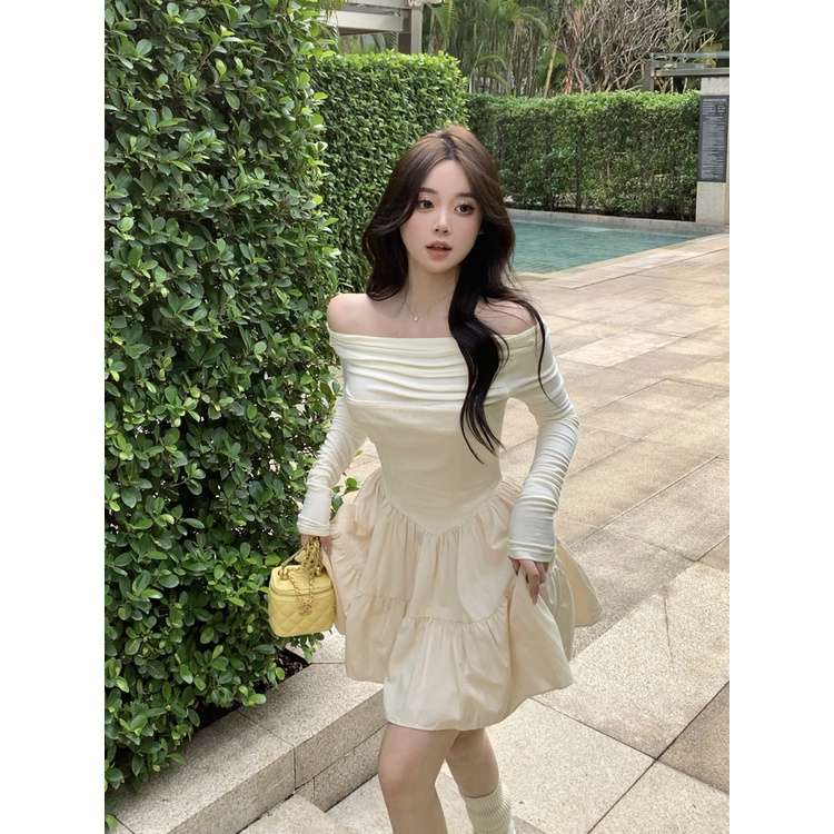 Red gaun one-shoulder kumikumi keinginan murni untuk menutup pinggang dan terlihat tipis lengan panjang rok A-line musim semi kecil rok pendek wanita