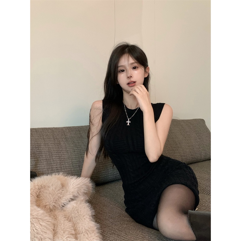 Detail Red Gaun sweter leher bulat tanpa lengan gaun musim panas wanita gaun babes hitam rok pendek pinggang ketat satu langkah tas rok pinggul rok rompi