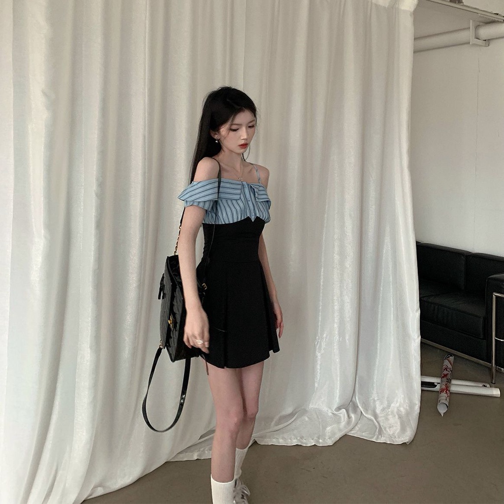 Red Gaya manis dan pedas tipis dan menutupi daging rok suspender satu bahu kecil gaun splicing garis vertikal biru bagian pendek