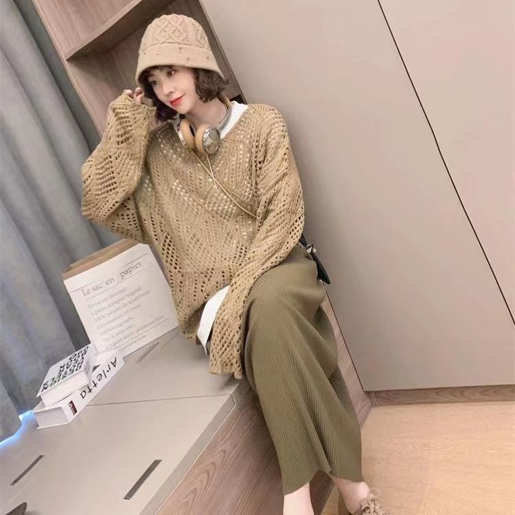 Pakaian Wanita > Sweater & Cardigan > Red Hollow Rajutan Sweater Wanita Dua Potong Musim Semi dan Musim Gugur Desain Tipis Rajutan Tabir Surya Pakaian Luar Kualitas Tinggi Hollow Out sweater Wanita