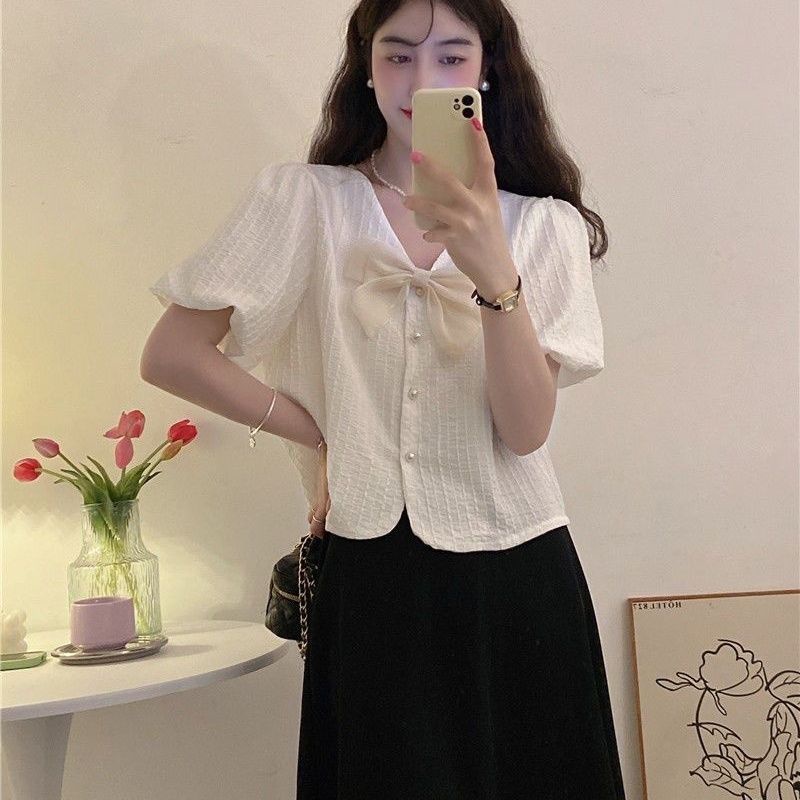 Pakaian Wanita > Batik > Atasan Batik > Red Ikatan simpul kemeja perempuan rasa desain ceruk musim panas gaya Korea baru lembut dan manis engah lengan pendek sifon top