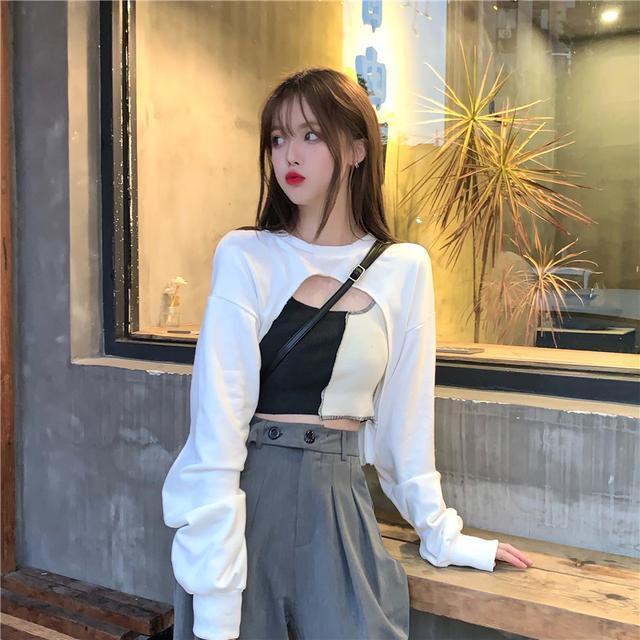 Pakaian Wanita > Batik > Set Wanita Batik > Red Ins minoritas Korea Selatan gaya asing warna kontras penyambungan bagian pendek pusar terbuka rompi tipis suspender + blus lengan panjang tidak beraturan trendi