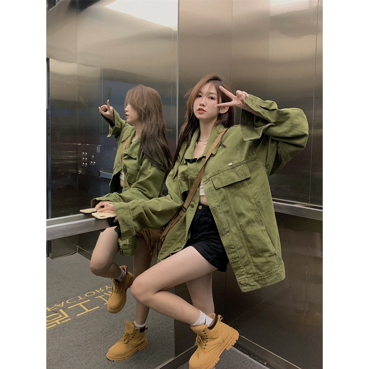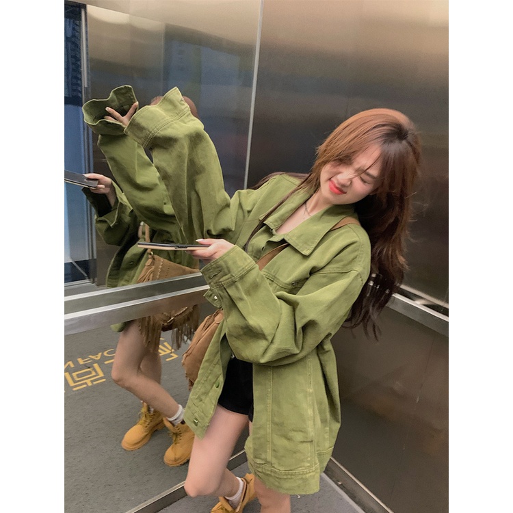 Pakaian Wanita > Batik > Outer Batik > Red Jaket denim hijau angin malas untuk wanita musim semi dan musim gugur pasangan jaket retro longgar Polo kerah lengan panjang cardigan top