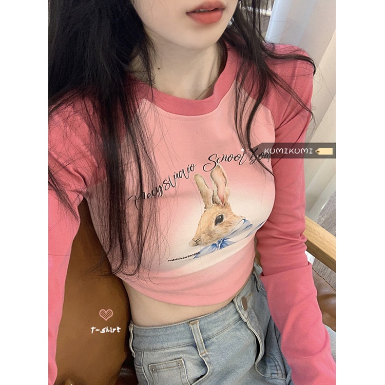 Red Kaos Ketat Gaya Amerika Wanita Baru Awal Musim Semi Lengan Panjang Pelangsing Kemeja Dasar Manis dan Pedas Pendek BM Angin Atasan