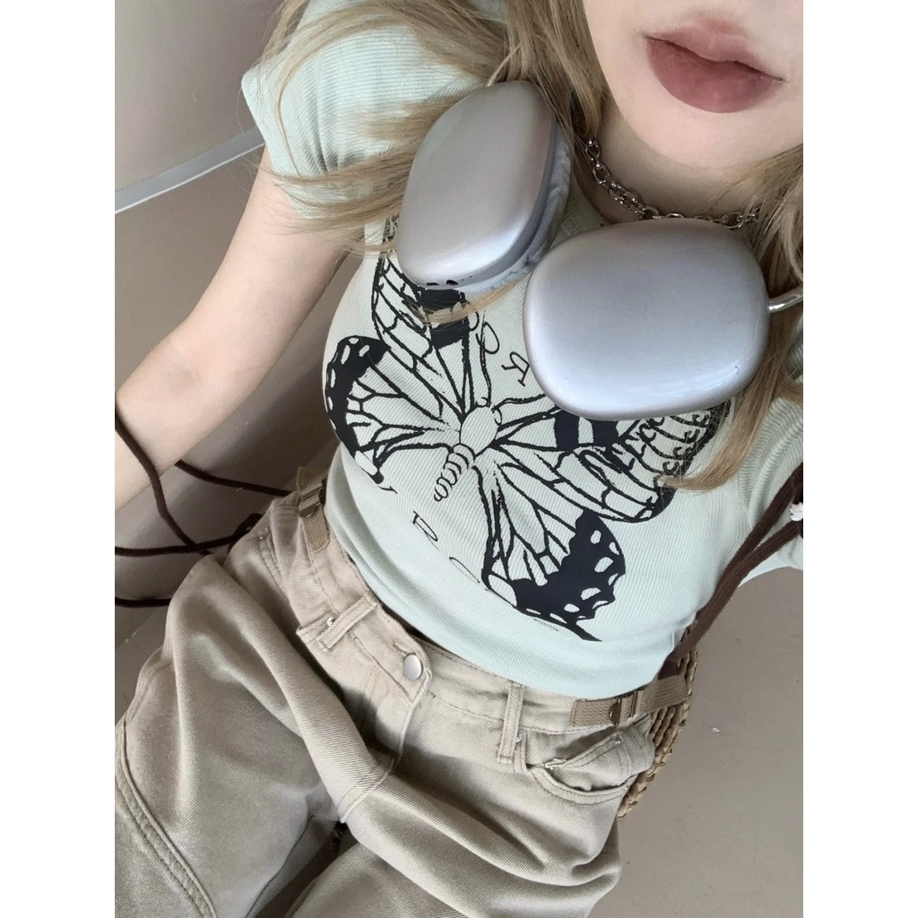 Red [Kapas Murni] American Retro Kupu-kupu Cetak Slim Fit Bahu Lengan Pendek T-Shirt Pusar Shower Pinggang Slim Manis Pedas In tren
