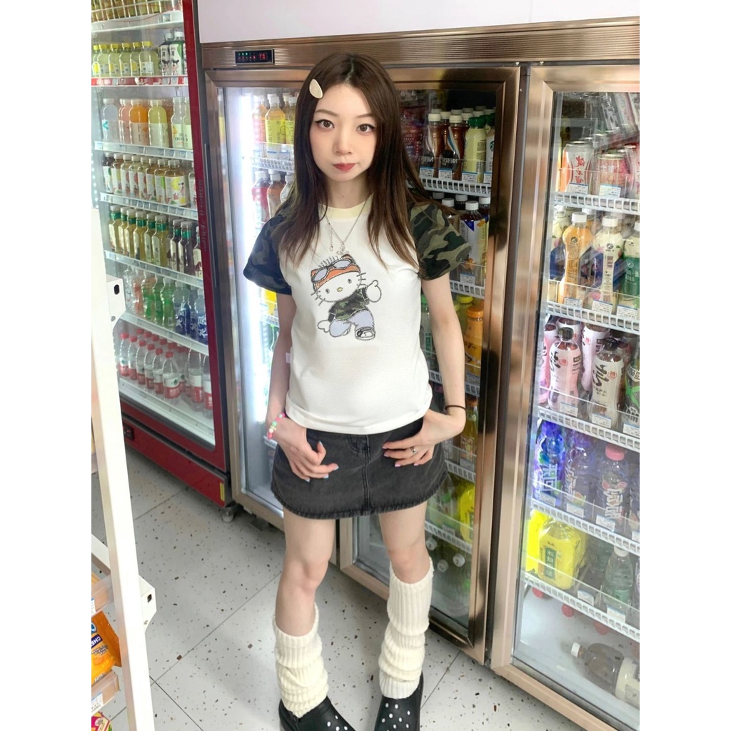 Red Kapas Murni Manis Keren Gadis Panas T-shirt Pendek Musim Panas Kamuflase KT Kucing Setrika Bor Lengan Pendek Rasa Desain Niche Slim BM Top