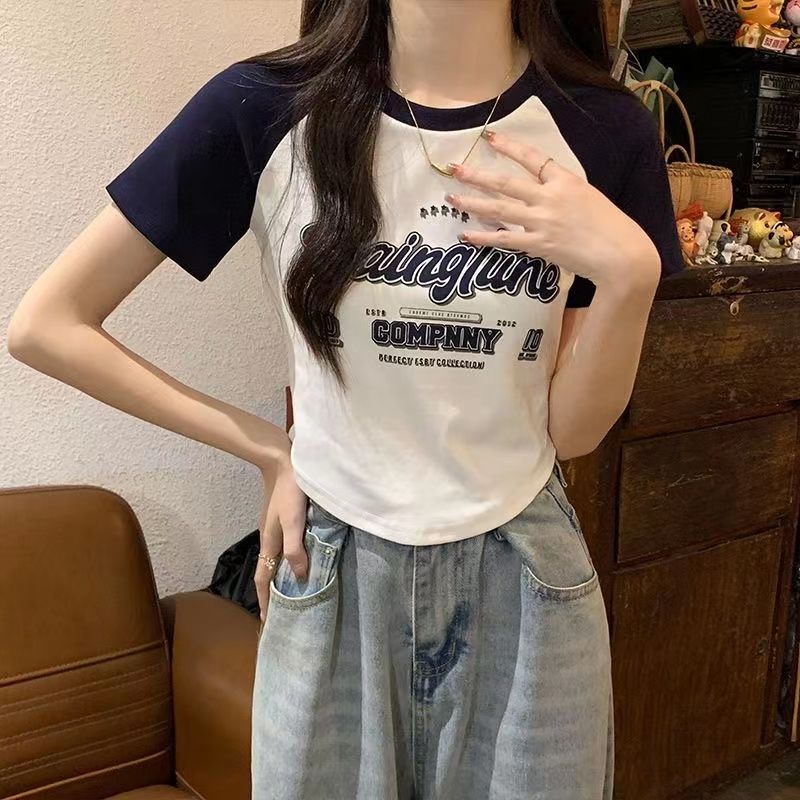 Detail Red Kapas murni musim panas versi Korea longgar lengan pendek wanita bagian pendek tidak beraturan tipis dan menutup perut atasan kaos bahu depan yang manis dan pedas