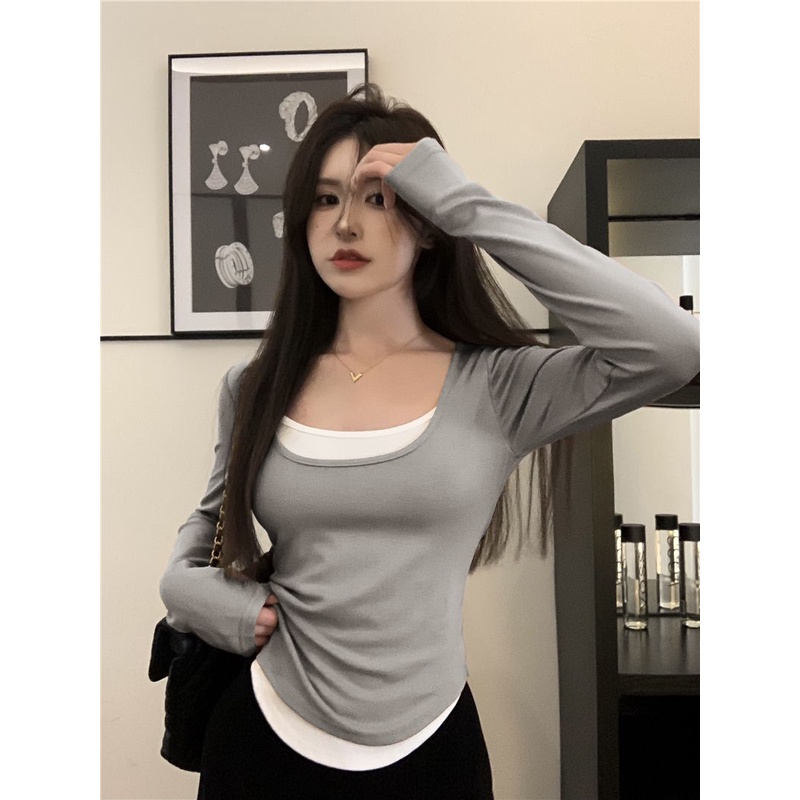 Red Kapas Murni Palsu Dua Potong Lengan Panjang T-shirt Wanita Ukuran Besar Musim Semi dan Musim Gugur Budidaya Diri Pelangsing Rasa Desain ceruk Dalam Kemeja Top