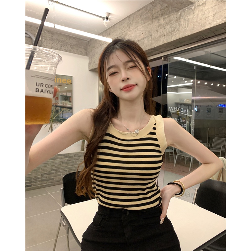 Detail Red Kasual Bergaris Rajutan Kamisol Wanita Musim Semi 2023 Baru Keinginan Murni Budidaya Diri Bagian Pendek Babes Pakaian Dalam Pasang Atas