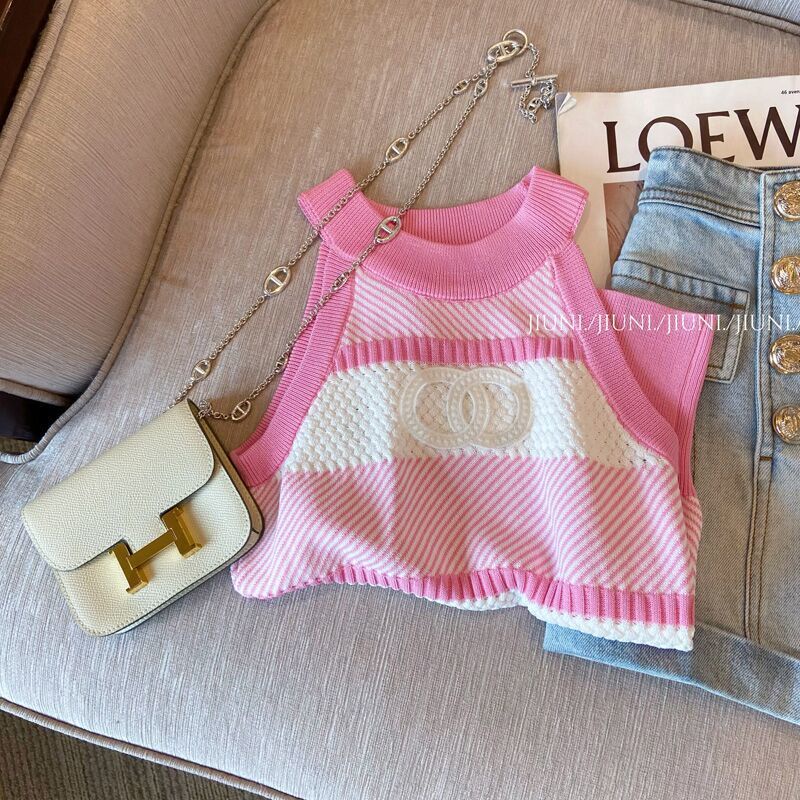 Pakaian Wanita > Batik > Atasan Batik > Red Keinginan Murni Gaya Bergaris Rajutan Halter Leher Rompi Pakaian Luar Wanita 2023 Musim Panas Baru Temperamen Slim Manis dan Pedas Atasan Tanpa Lengan