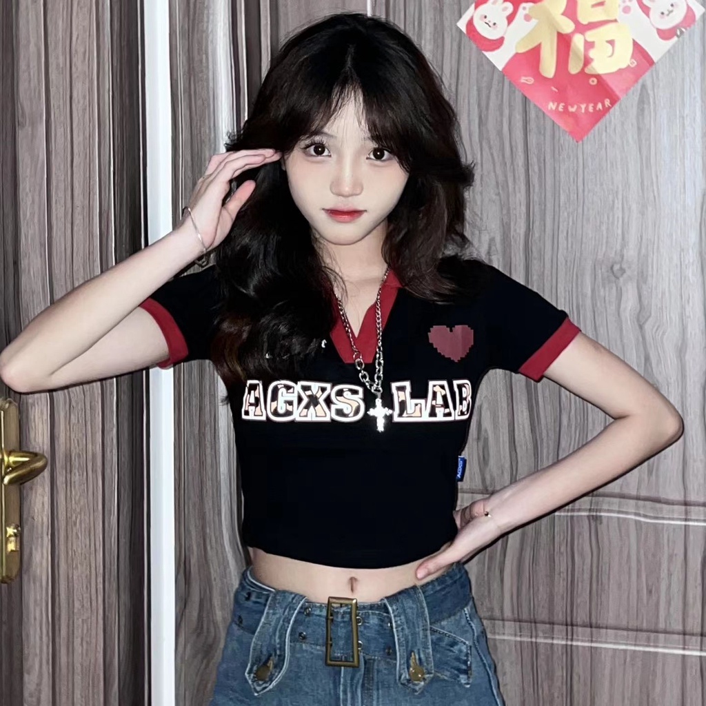 Detail Red Keinginan Murni Gaya Polo Kerah Lengan Pendek T-shirt Wanita Musim Panas Baru Budidaya Diri Bagian Pendek In Gadis Panas mahasiswa Pusar Slimming Top