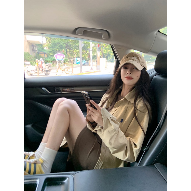 Detail Red Khaki kemeja jaket wanita musim panas baru kardigan longgar kemeja kecil desain atasan lengan panjang