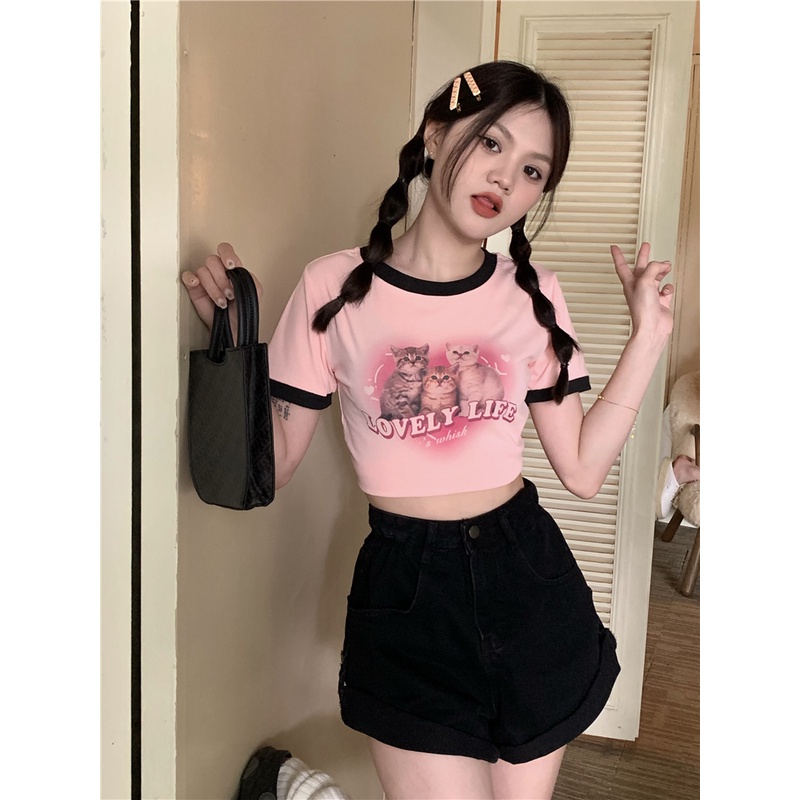 Red Kumikumi Lengan Pendek T-shirt Wanita Musim Panas Leher Bulat Warna Kontras Slim Kucing Cetak Kemeja Manis dan Pedas pendek Top
