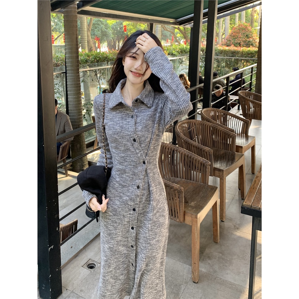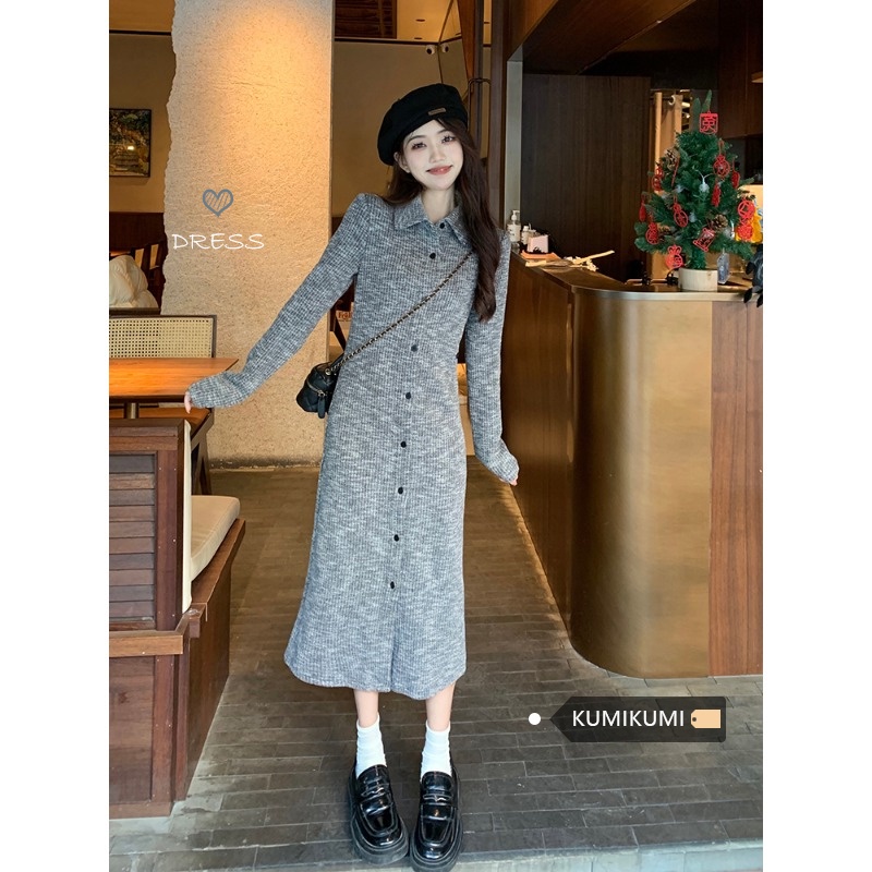 Red Kumikumi retro lengan panjang rajutan gaun desain musim semi rasa pinggang pelangsing mid-panjang rok temperamen rok wanita