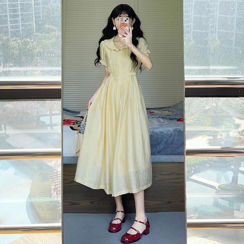 Detail Red Lengan kembung kerah boneka gaun kuning wanita musim panas teh istirahat platycodon gaun Prancis 2023 gaun musim semi baru