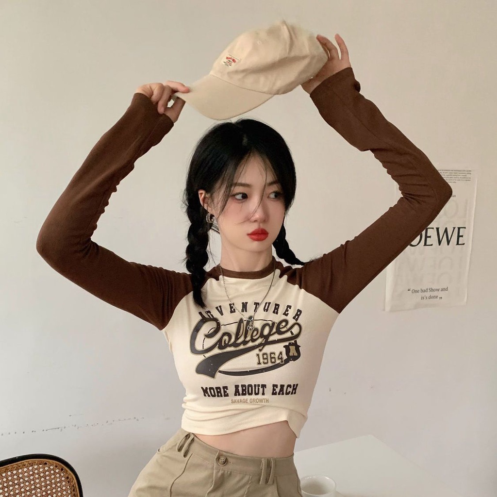 Pakaian Wanita > Batik > Atasan Batik > Red Lengan Raglan Cetak Huruf Lengan Panjang T-shirt Wanita 2023 Baru Gaya Amerika Retro Gadis Panas Slim Slim Top
