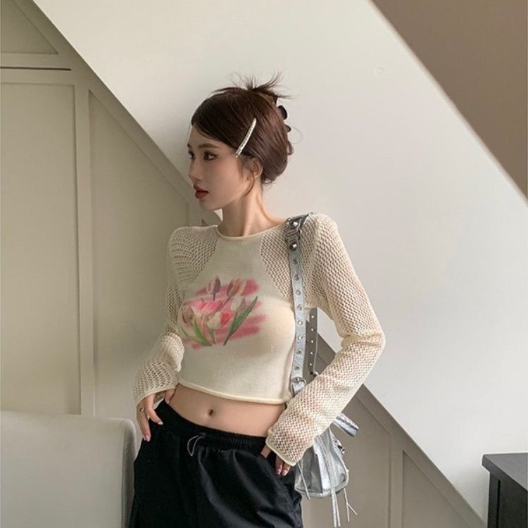 Pakaian Wanita > Atasan > Kemben > Red Manis dan Pedas Hollow Mesh Pakaian Rajut Pakaian Wanita Musim Panas 2023 Gaya Baru Dalam Lengan Panjang Rasa Desain Niche Slim tops