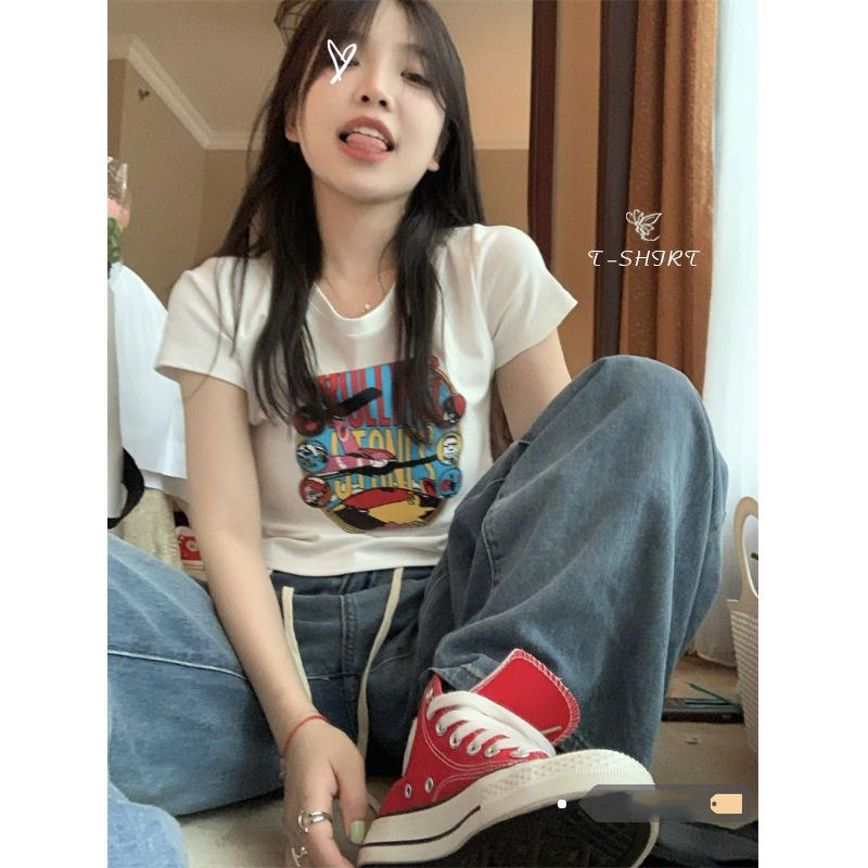 Pakaian Wanita > Batik > Atasan Batik > Red Manis dan pedas putih dicetak bahu depan T-shirt wanita musim panas versi Korea baru retro slim fit dan tipis pendek lengan pendek pasang atas