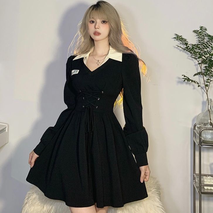 Detail Red Manis dan pedas retro gaya gelap chic warna kontras kerah gaun lengan panjang desain wanita terasa ramping pinggang V-neck rok A-line