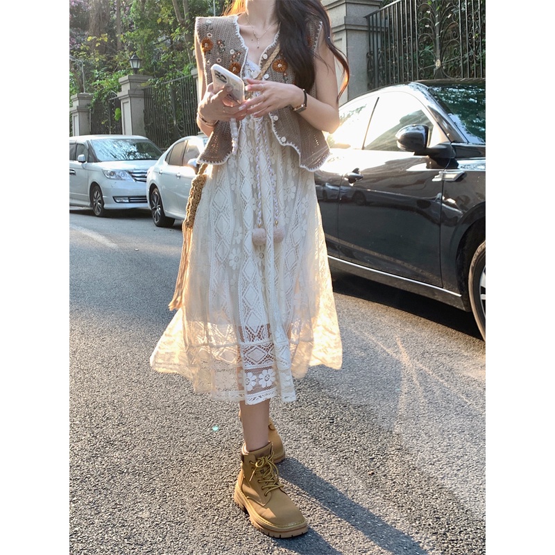Pakaian Wanita > Batik > Set Wanita Batik > Red Musim Panas Retro Net Merah Usia Mengurangi Panjang Rok Mesh Suspender Gaun Pakaian Wanita Cardigan Rompi Setelan Jas dua Potong