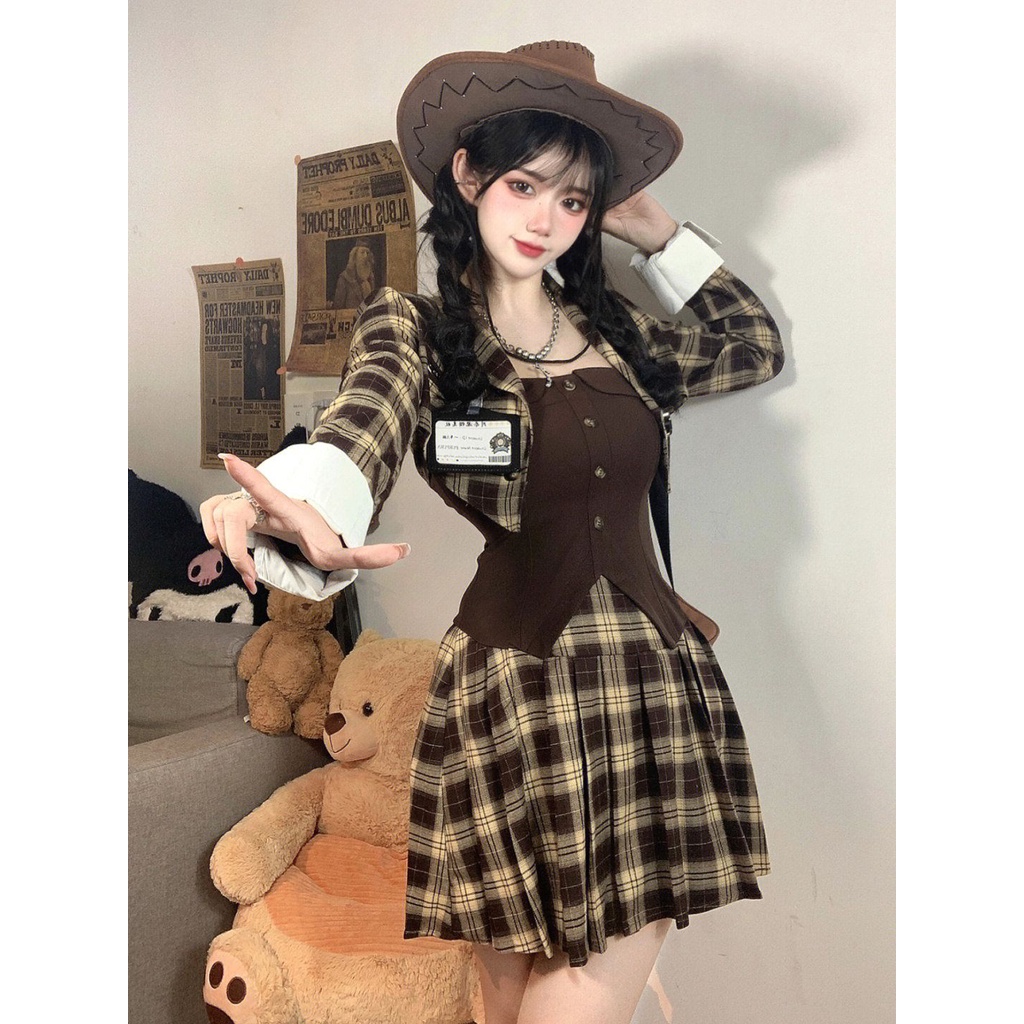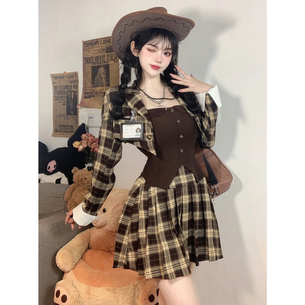 Detail Red Musim Semi dan Musim Gugur Baru Manis dan Pedas Kotak-kotak Kecil Wewangian Setelan Wanita Desain Korea Street College Memakai Gaun Dua Potong