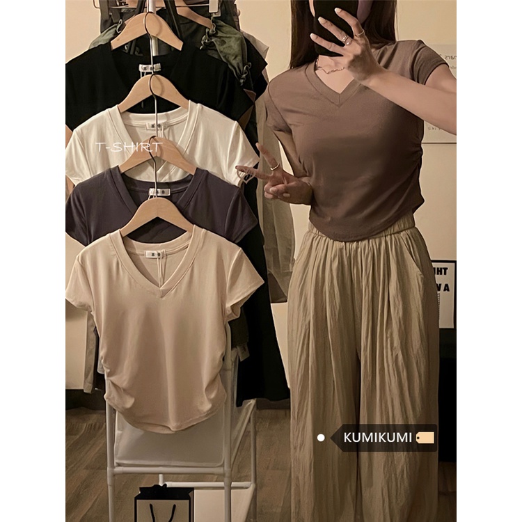 Red Net Merah Gaya Slim V-Leher Lengan Pendek T-shirt Top Wanita 2023 Musim Panas Warna Solid Dasar Rasa Desain Kemeja In Tide