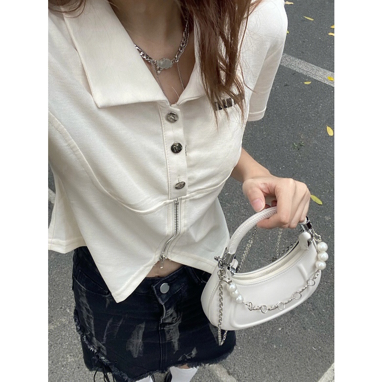 Detail Red Niche chic Hong Kong rasa tidak teratur polo kerah lengan pendek t-shirt wanita gaya Amerika manis dan pedas splicing pendek slim top musim panas