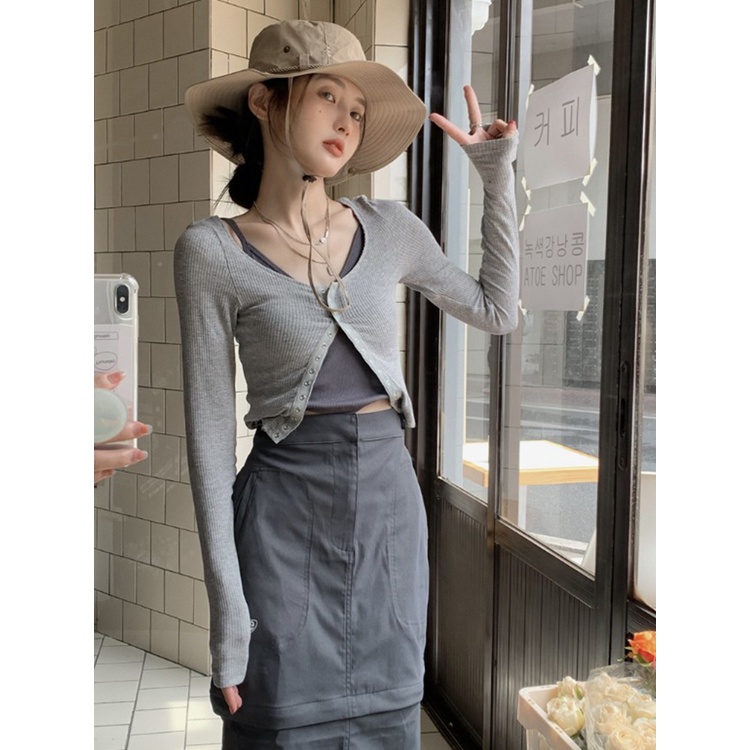 Pakaian Wanita > Batik > Atasan Batik > Red Pendek ketat manis dan pedas T-shirt wanita musim panas rasa desain ceruk hot girls memakai abu-abu lengan panjang chic top suit